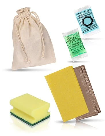 Inhalt: Die Bestellung umfasst 50 Reinigungssets. Jede Packung enthält: 1 gelben Putzlappen, 1 gelben Putzschwamm & 1 Sachet Geschirrspülmittel.
