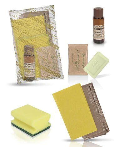 Inhalt: Die Bestellung umfasst 50 Bio Reinigungssets. Jede Packung enthält: 1 gelben Putzlappen, 1 gelben Putzschwamm, 1 Flasche Bio Geschirrspülmittel 30ml, 1 Bio Handseife 10gr & 1 Mülltüte.