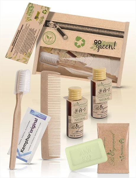 Necessaire bestehend aus Zahnbürste (biologisch abbaubar), Zahnpasta im Sachet, Kamm (biologisch abbaubar), Handseife, Duschgel und Shampoo im Flakon 30 ml. Verpackt in einem Einweg-Necessaire aus Kraftpapier.